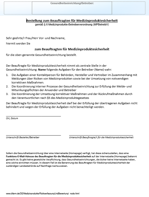 Seit dem 01.01.2017 müssen Gesundheitseinrichtungen mit mehr als 20 Beschäftigten einen Beauftragten für die Medizinproduktesicherheit bestellen. Beigefügt finden Sie ein Muster des entsprechenden Formulars gemäß § 6 Medizinprodukte-Betreiberverordnung (MPBetreibV).[